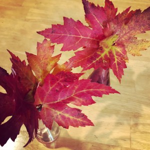my autumn decoration made with leaves from my maple tree and tiny vases. they are spread all over my home now. I do this every year, autumn leaves replacing the summer flowers.