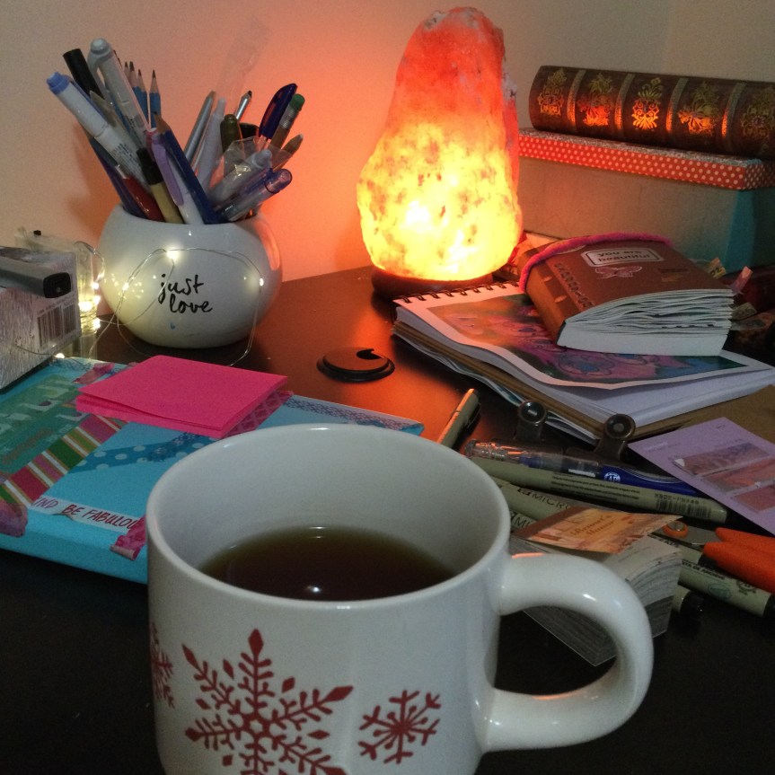 The space where I journal is always messy. I organize it once in a while, but soon it goes back to its natural state. I like this way, papers and colours spread everywhere. I enjoy looking under piles of stuff and finding some treasure buried there. Pens and pencils should be at hand as well as stickers.