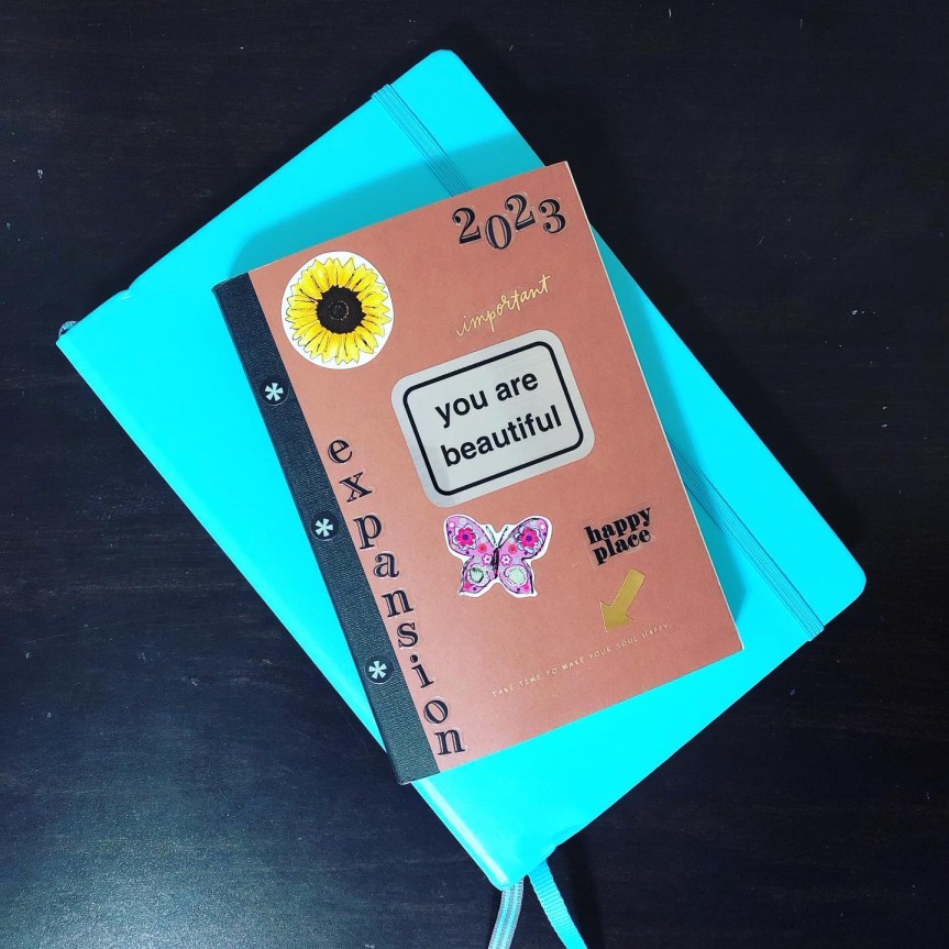 I added my own stickers on the cover to personalize it. I only kept the message on the bottom, it goes well with my journaling intention.