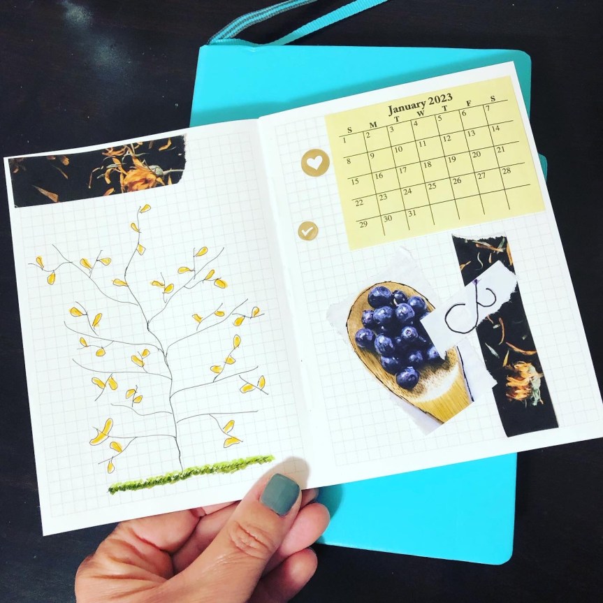 These are my new journals for the start of the year. The blue one is for morning pages and occasional writing. It has dotted pages, so I can write both ways, vertically or horizontally depending on my mood.